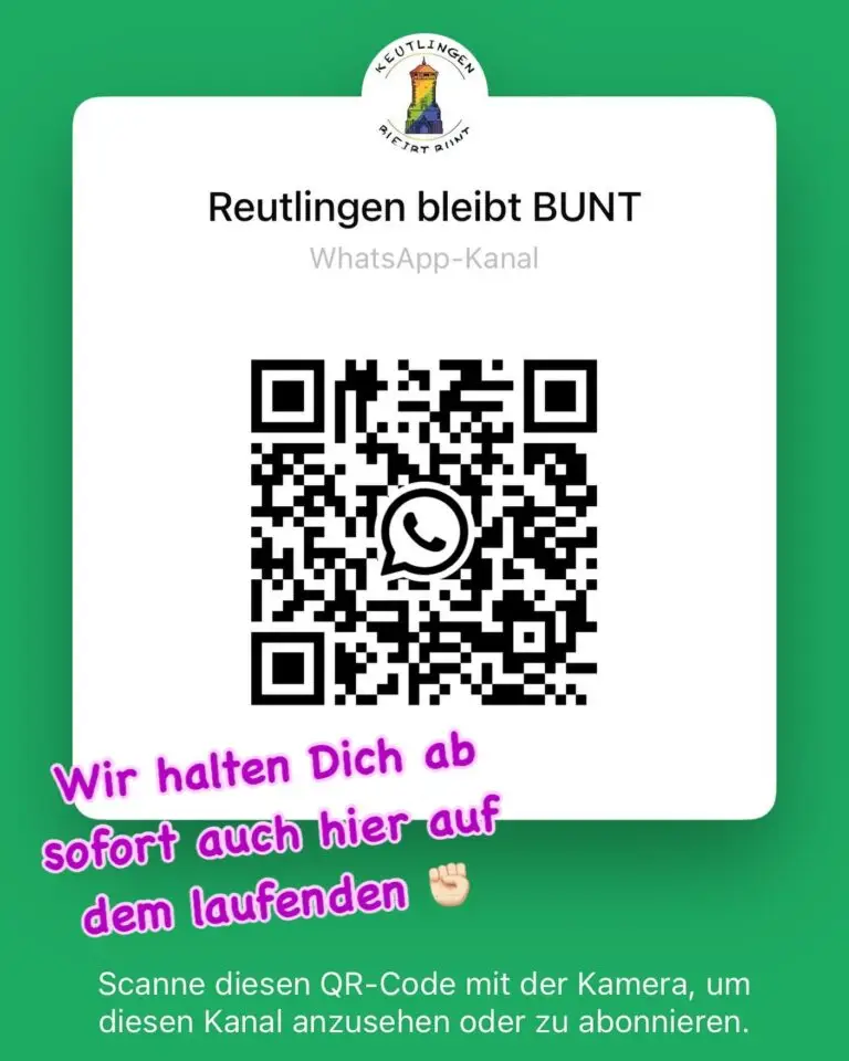 Über unseren WhatsApp-Kanal „Reutlingen bleibt BUNT“ bist du jederzeit über unsere Aktivitäten und Aktionen laufend informiert.